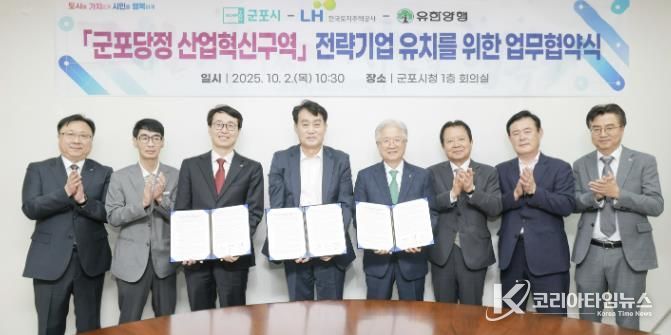코리아타임뉴스 사회팀 | 군포시는 2일 군포시청에서 한국토지주택공사(LH), ㈜유한양행과 ‘군포당정 산업혁신구역’ R·D 전략기업 유치를 위한 업무협약을 체결했다고 밝혔다.
