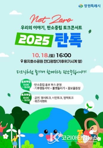 코리아타임뉴스 오영주 기자 | 창원특례시는 오는 10월 18일 오후 4시 용지호수공원 탄소제로하우스 앞 잔디광장에서 기후위기 대응과 탄소중립 실천 문화를 확산하기 위해 탄소중립 토크콘서트 ‘2025탄톡’을 개최한다.