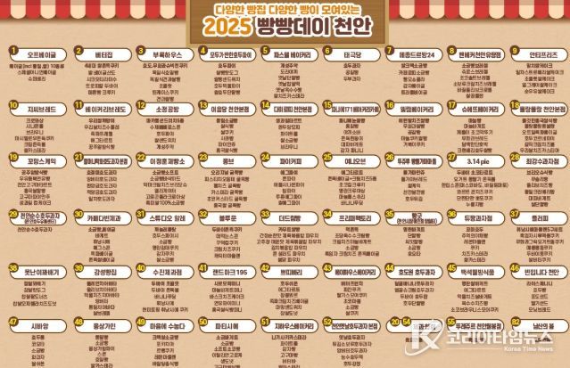 시 관계자는 “‘빵빵데이 천안 2025’은 빵의 도시 천안을 대표하는 빵 축제인 만큼 다양한 체험행사와 이벤트, 동네빵집의 개성이 담긴 빵, 쌀을 원재료로 한 빵을 준비했다”고 말했다.