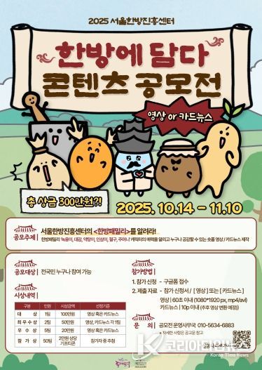 코리아타임뉴스 의료보건팀 | 서울 동대문구는 한방산업특구 서울약령시에 위치한 서울한방진흥센터(서울약령시한의약박물관)가 ‘2025 한방에 담다 콘텐츠 공모전’을 개최한다고 밝혔다.