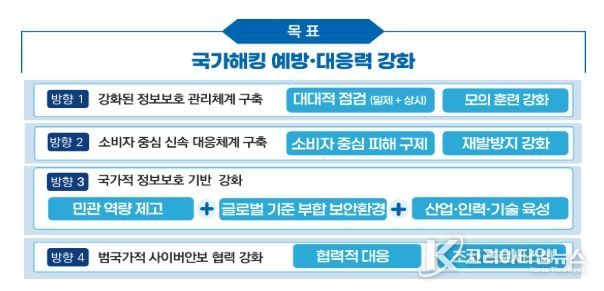 코리아타임뉴스 오영주 기자 | 과학기술정보통신부와 관계부처는 전방위적인 해킹 사고로 국민 불안이 가속화되는 현 상황을 신속히 극복하고 국가 전반의 정보보호 역량을 강화하기 위해 '범부처 정보보호 종합대책'을 수립하여 10월 22일 대국민 브리핑을 통해 발표했다.