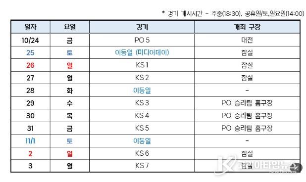코리아타임뉴스 스포츠팀 | 삼성 라이온즈와 한화 이글스의 2025 신한 SOL뱅크 KBO 플레이오프 5차전이 10월 24일(금)에 개최된다. 따라서 포스트시즌 각 시리즈 간 최소 1일의 이동일이 확보되어야 하는 규정에 의거, 이후에 예정된 한국시리즈의 모든 일정이 하루씩 늦춰진다.