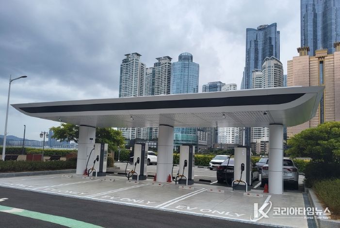 코리아타임뉴스 이아름 기자 | 해운대구는 동백공원 공영주차장(우동 721)에 초고속 충전이 가능한 350kw급 전기차 충전기 4기를 설치했다.
