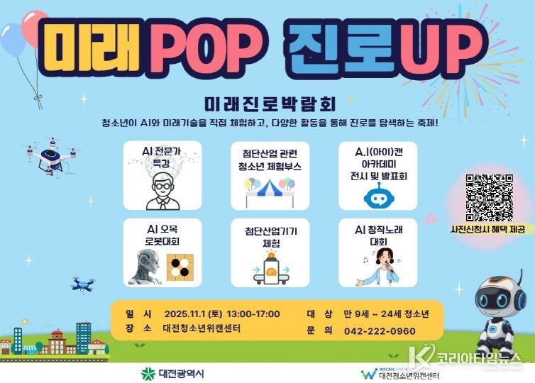 코리아타임뉴스 윤광희 기자 | 대전시는 AI 및 미래 기술 관련 체험 기회를 제공하고 진로 탐색을 돕기 위한‘2025년 미래POP 진로UP 미래진로박람회’를 11월 1일 개최한다.