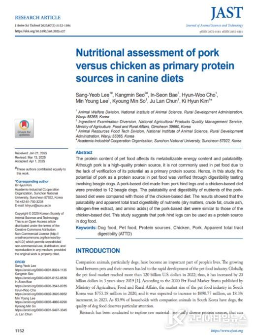 농촌진흥청 국립축산과학원 동물복지과 이휘철 과장은“돼지고기 뒷다리 살은 영양가와 기호성을 갖춘 국산 단백질원으로, 반려견 사료에 충분히 활용할 수 있다.”라며“국산 원료 기반의 반려동물 사료 개발이 확대될 수 있도록 연구를 이어가겠다.”라고 밝혔다.