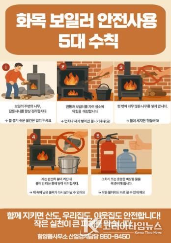 코리아타임뉴스 오영주 기자 | 함양읍은 11월 19일 본격적인 겨울철을 앞두고 산불 예방 5대 수칙과 화목보일러 안전 사용 5대 수칙을 담은 ‘자체 제작 안전 홍보 포스터’를 제작해 관내 마을회관과 경·노모당 91개소에 배부하고 부착할 예정이라고 밝혔다.