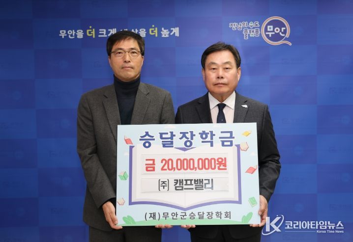 코리아타임뉴스 노승선 기자 | 전남 무안군은 지난 20일 주식회사 캠프밸리에서 지역 인재 육성을 위해 (재)무안군승달장학회에 장학금 2천만 원을 기탁했다고 밝혔다.