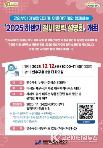 코리아타임뉴스 이아름 기자 | 연수구는 다음 달 12일 오전 10시부터 구청 대회의실에서 유용한 세무 정보를 제공하는 ‘2025 하반기 절세 전략 설명회’를 연다.