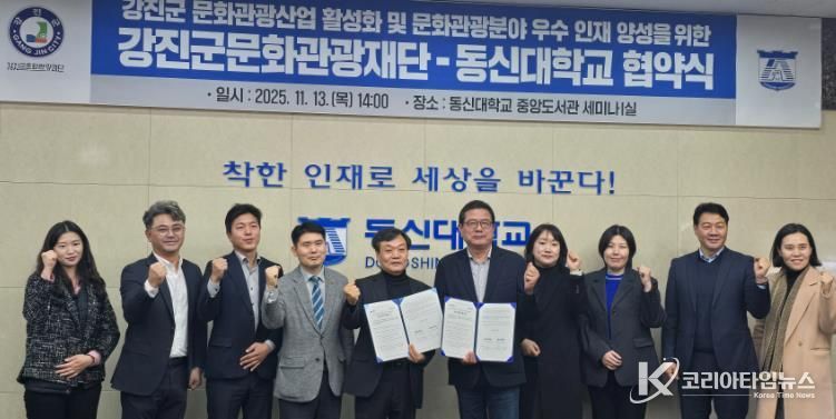 코리아타임뉴스 노승선 기자 | 강진군문화관광재단이 최근 동신대와 문화관광산업의 미래 경쟁력 강화와 우수 인재 양성 상호협력에 관한 협약을 체결했다.