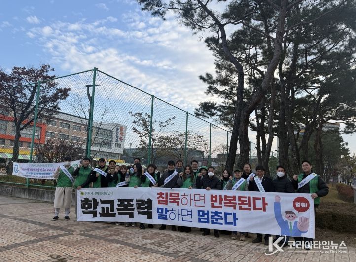 코리아타임뉴스 경북취재본부 | 김천시청년새마을연대(회장 이동협)와 김천경찰서는 24일 아침, 율곡초등학교 및 율곡중학교 앞에서 학교폭력 근절 합동 캠페인을 전개했다.