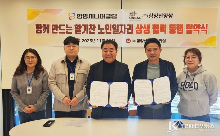 코리아타임뉴스 오영주 기자 | 함양시니어클럽(관장 김용환)은 21일 글로벌 수출 선도기업인 농업회사법인 ㈜함양산양삼(대표 이종상)과 노인일자리사업 및 지역사회 상생발전을 위한 업무협약(MOU)을 체결했다고 밝혔다.
