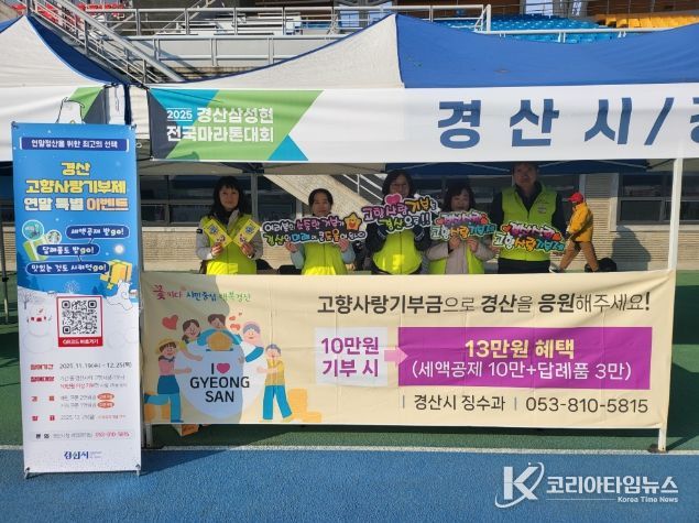 코리아타임뉴스 경북취재본부 | 경산시는 23일 경산시민운동장에서 시작하여 경산시 일대를 돌아오는 2025 삼성현 전국 마라톤대회에서 경산 고향사랑기부제 홍보를 실시했다.