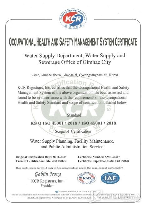 코리아타임뉴스 오영주 기자 | 김해시는 상수도 분야에서 안전보건 국제표준인 ISO 45001(안전보건경영시스템) 인증을 취득했다고 26일 밝혔다.