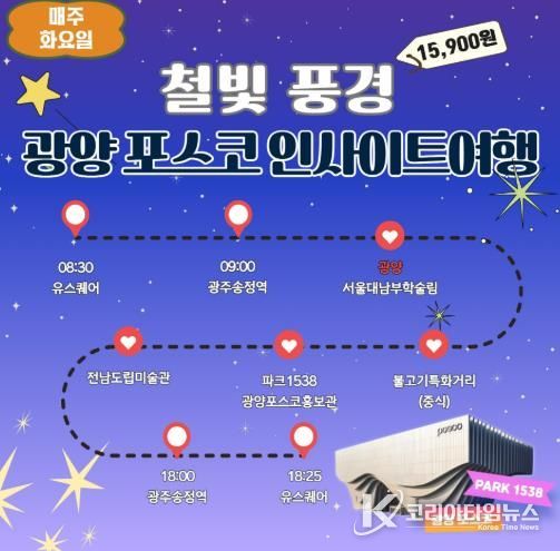 투어는 유스퀘어(08:30) 출발 → 광주송정역(09:00) → 서울대 남부학술림 → 광양불고기특화거리(중식) → 포스코홍보관 Park1538 → 전남도립미술관 → 송정역(18:00) → 유스퀘어(18:25) 순으로 진행된다.