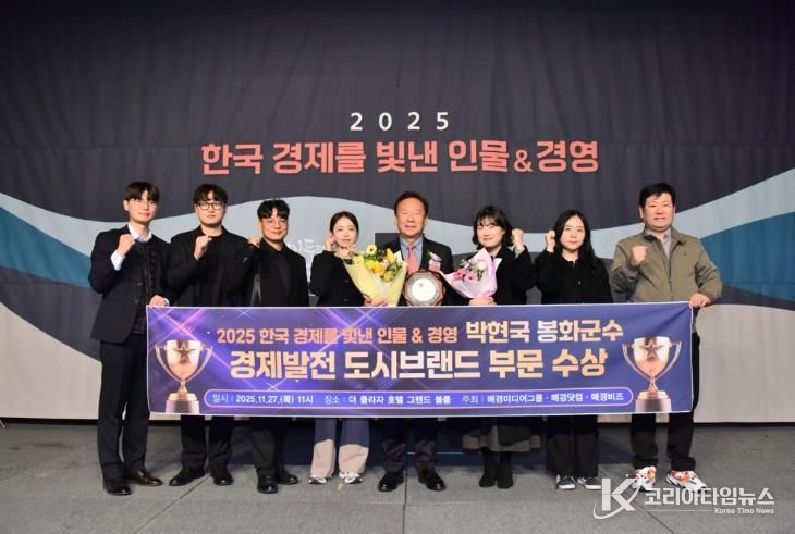 코리아타임뉴스 경북취재본부 | 경상북도 봉화군은 박현국 봉화군수가 2025 한국 경제를 빛낸 인물&경영 시상식에서 ‘경제발전 도시브랜드부문’을 수상했다고 밝혔다.