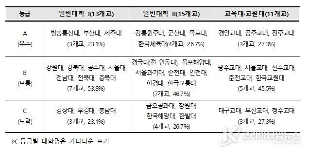 국립대(37개교) 및 국립대법인(2개교) 총 39개교를 전임교원 수에 따라 일반대 Ⅰ(13개교), 일반대 Ⅱ(15개교), 교육대·교원대(11개교)로 분류하여 점검을 실시했으며, 주요 결과는 다음과 같다.