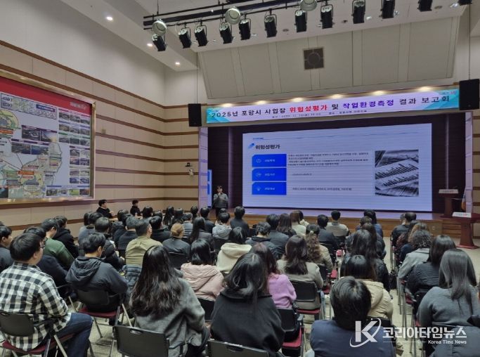 코리아타임뉴스 경북취재본부 | 포항시는 28일 시청 대회의실에서 시 직영 사업장의 관리감독자와 사업 담당자 등 100여 명이 모인 가운데 ‘2025년 포항시 사업장 위험성평가 컨설팅 및 작업환경측정 용역 결과 보고회’를 개최했다.