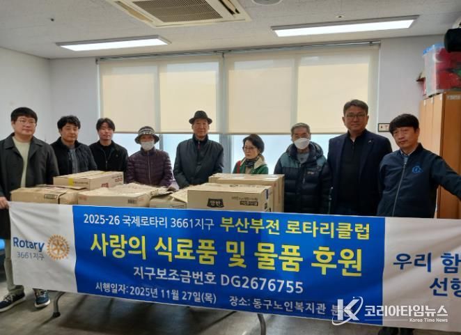 코리아타임뉴스 부산취재본부 | 부산부전로타리클럽은 11월27일 동구노인복지관 분관에 사랑의 식료품 및 물품을 후원하며 지역사회 나눔을 실천했다.
