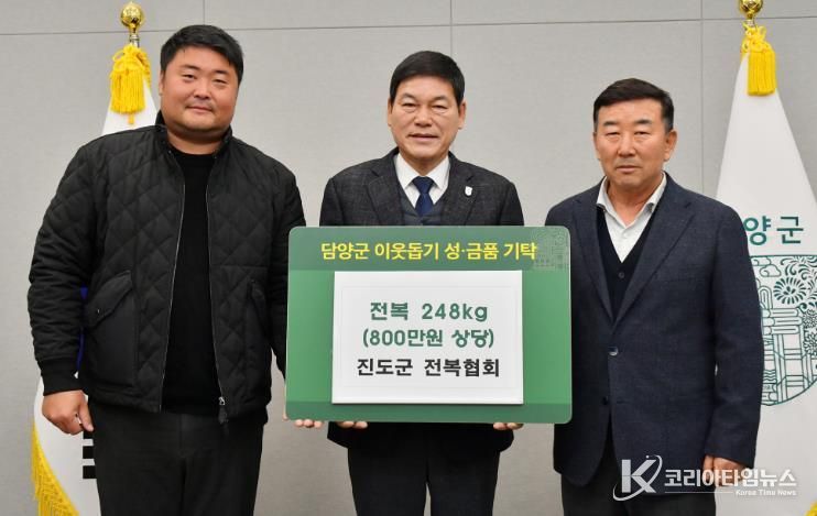 담양군에 따르면, ㈜글로벌이지스에서 자동소화 멀티탭 312개(1,200만 원 상당), 진도군 전복협회에서 전복 248kg(800만 원 상당을 기탁했다.