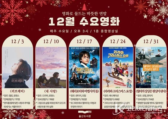 코리아타임뉴스 울산취재본부 | 울산도서관이 12월 한 달 동안 ‘영화로 물드는 따뜻한 연말’을 주제로 매주 수요일 오후 3시 도서관 1층 종합영상실에서 수요영화를 상영한다.