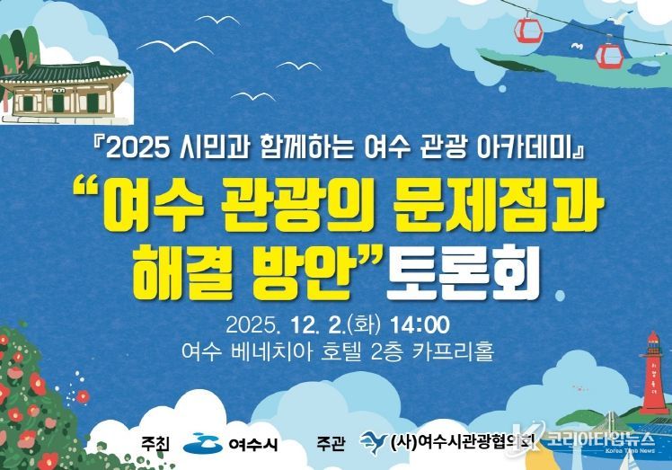 코리아타임뉴스 전남취재본부 | 여수시는 오는 12월 2일 오후 2시 여수 베네치아 호텔에서 ‘여수 관광의 문제점과 해결 방안’을 주제로 토론회를 개최한다.