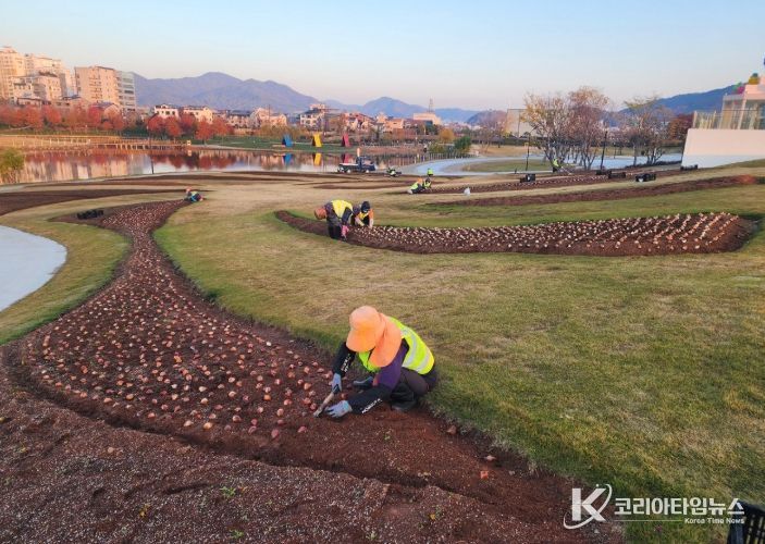 코리아타임뉴스 전남취재본부 | 순천시는 최근 2026년 봄 오천그린광장을 화사하게 수놓을 봄꽃 연출을 위해 총 20개 품종, 7만 본의 알뿌리 식재 작업을 완료했다고 밝혔다.