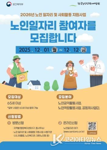코리아타임뉴스 경북취재본부 | 김천시는 오는 12월 1일부터 12월 12일까지 2주간 노인일자리 및 사회활동 지원사업 참여자를 모집한다고 밝혔다.