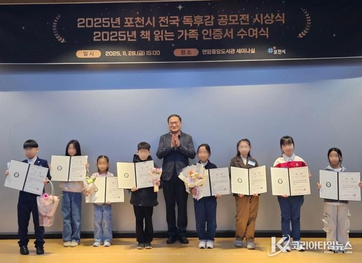 코리아타임뉴스 윤광희 기자 | 포천시는 지난 11월 28일 면암중앙도서관 세미나실에서 ‘2025년 전국 독후감 공모전 시상식 및 책 읽는 가족 인증서 수여식’을 성황리에 개최했다.