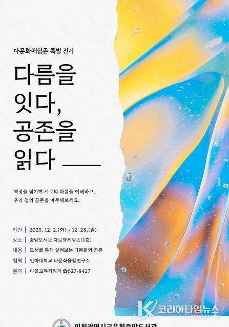 코리아타임뉴스 사회팀 | 인천광역시교육청중앙도서관은 12월 2일부터 28일까지 1층 다문화체험존에서 다문화 특별 전시 ‘다름을 잇다, 공존을 읽다’를 진행한다.