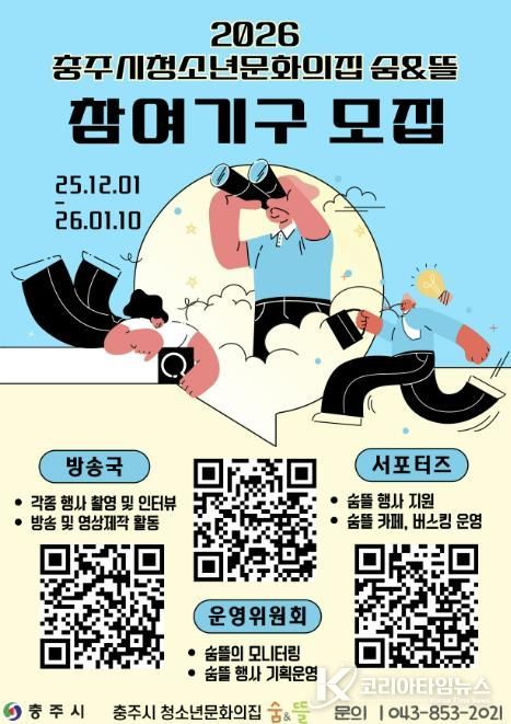 코리아타임뉴스 박찬식 기자 | 충주시청소년문화의집 숨&뜰은 2026년을 함께할 청소년 참여기구 신규부원을 모집한다고 4일 밝혔다.