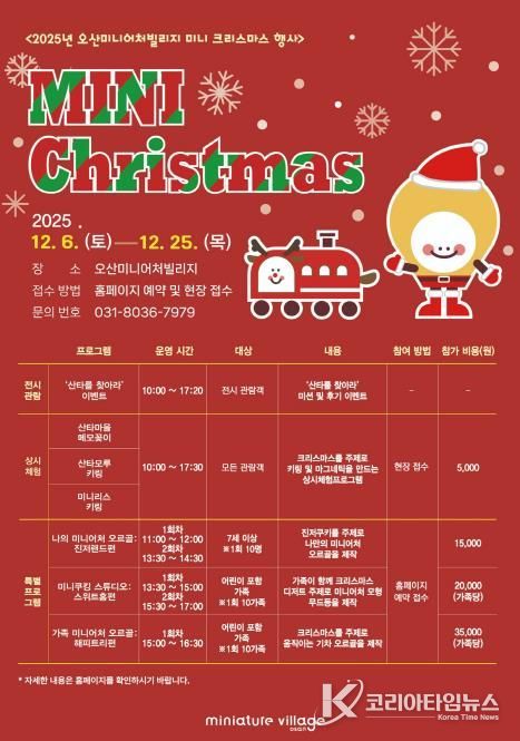 코리아타임뉴스 기동취재팀 | 오산시는 12월을 맞아 ‘미니 크리스마스’ 행사를 오는 12월 6일부터 25일까지 17일간 오산미니어처빌리지에서 개최한다고 밝혔다. 행사는 오전 10시부터 오후 6시까지 진행되며, 크리스마스를 주제로 전 연령이 함께 즐길 수 있는 전시와 체험 프로그램 등 풍성한 콘텐츠가 마련된다.