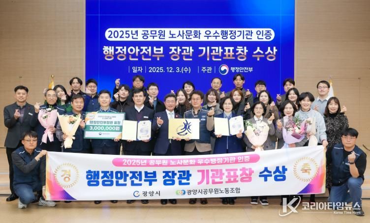 코리아타임뉴스 전남취재본부 | 광양시가 행정안전부가 주관한 ‘2025년 공무원 노사문화 우수행정기관 인증제’ 심사에서 우수행정기관으로 선정돼 행정안전부장관 표창을 수상했다.