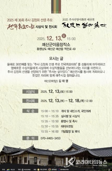 코리아타임뉴스 김택호 기자 | 예산문화원은 지난 10월 11일 개최된 ‘제36회 추사김정희선생 추모 전국휘호대회’ 시상식을 오는 12월 13일 예산군 이음창작소에서 진행한다고 밝혔다.