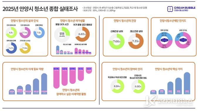 코리아타임뉴스 사회팀 | 안양시청소년재단은 5일 관내 초등학교 4학년부터 고등학교 3학년까지 재학 중인 청소년 2,782명과 학교 밖 청소년 53명을 대상으로 실시한 ‘2025년 안양시 청소년 종합 실태조사’ 결과를 발표했다.
