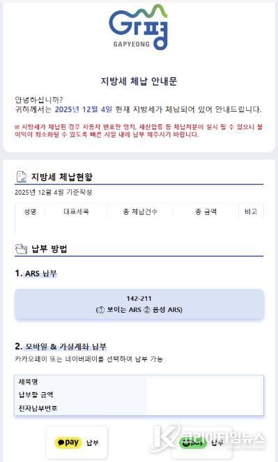 코리아타임뉴스 기동취재팀 | 가평군이 지방세 체납액 징수 강화를 위해 최근 체납자 4,790명에게 총 44억 원 규모의 지방세 체납안내문을 카카오톡 모바일 전자고지로 일제히 발송했다.