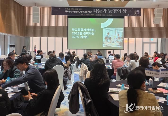 코리아타임뉴스 사회팀 | 경상남도교육청은 4~5일 이틀간 ‘학교통합지원센터, 나눔과 동행의 장’을 주제로 2025년 학교통합지원센터 운영 성과를 공유하고 2026년의 새로운 발전 방향을 모색하는 성과 공유마당을 한화리조트 거제 벨버디어에서 개최했다.