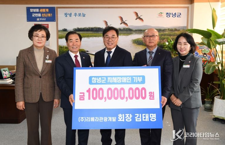 코리아타임뉴스 경남취재본부 | 창녕군 출신의‘기부 천사’(주)리베라관광개발 김태명 회장이 올해도 변함없이 어려운 장애인을 위해 써달라며 5일 성낙인 창녕군수를 찾아 1억 원을 기탁했다.
