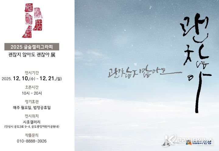 코리아타임뉴스 경기취재본부 | 공도 작은미술관 시옷갤러리는 오는 12월 10일부터 12월 21일까지 글숲 캘리그라피 작가들이 참여하는 전시 ‘괜찮지 않아도 괜찮아’ 전을 개최한다.