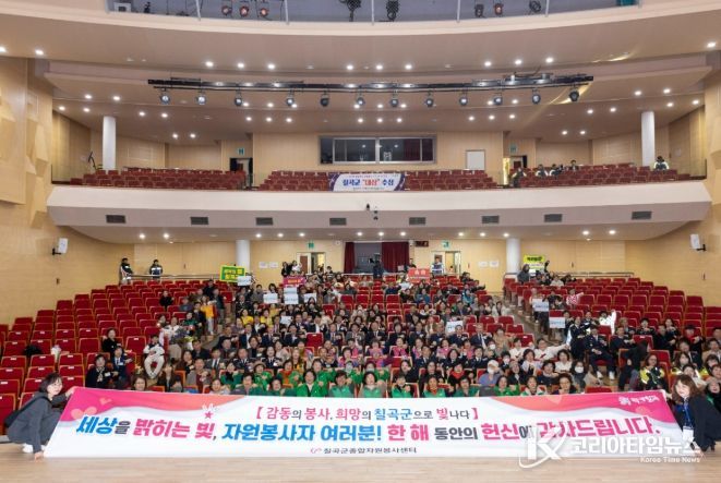 코리아타임뉴스 경북취재본부 | 칠곡군은 지난 3일 칠곡군 왜관읍에 위치한 칠곡군 교육문화회관에서 ‘감동의 봉사, 희망의 칠곡군으로 빛나다’라는 주제로 김재욱 칠곡군수, 이상승 칠곡군의회 의장을 비롯한 주요 기관단체장과 자원봉사자 700여명이 참석한 가운데‘2025년 칠곡군 자원봉사자 대회’를 개최했다.