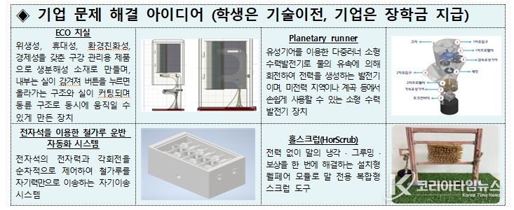 산업현장 과제를 해결한 아이디어 21건은 기업으로 기술이전 되어 활용될 예정으로, 해당 아이디어를 제시한 학생들은 기술 이전료를 장학금으로 지원받게 된다.