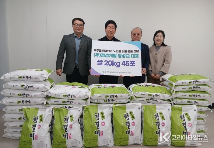 코리아타임뉴스 울산취재본부 | 울주군시설관리공단(이사장 최인식) 중부장애인복지관은 12월 16일, ㈜정성개발(대표 정성교)로부터 백미 20kg 45포를 후원받아 전달식을 진행했다.