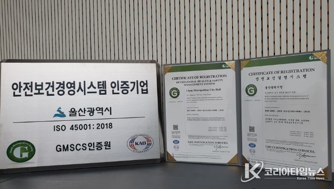 코리아타임뉴스 울산취재본부 | 울산시는 국제표준화기구(ISO)로부터 ‘안전보건경영시스템(ISO 45001)’ 국제인증을 취득했다고 밝혔다.