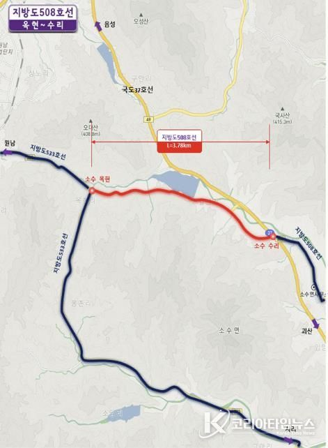 코리아타임뉴스 박찬식 기자 | 충북 괴산군은 지방도508호선 소수면 옥현리에서 수리를 연결하는 ‘옥현~수리 도로개량공사 기본 및 실시설계용역’에 착수한다고 17일 밝혔다.
