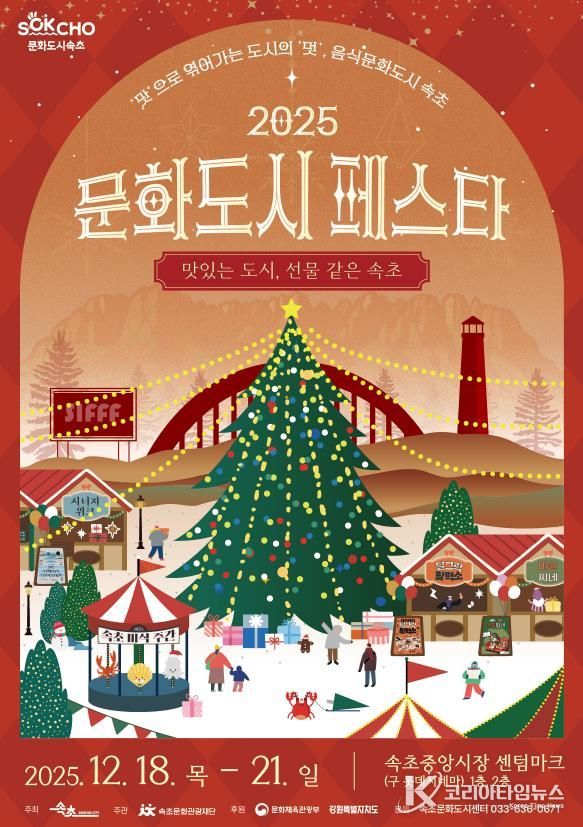 코리아타임뉴스 노승선 기자 | (재)속초문화관광재단은 속초시의 대한민국 문화도시 1년 차 사업을 마무리하며 오는 12월 18일부터 21일까지 4일간 속초중앙시장 센텀마크(구 롯데시네마) 에서 대한민국 문화도시 성과공유회‘2025 문화도시 페스타’를 개최한다.