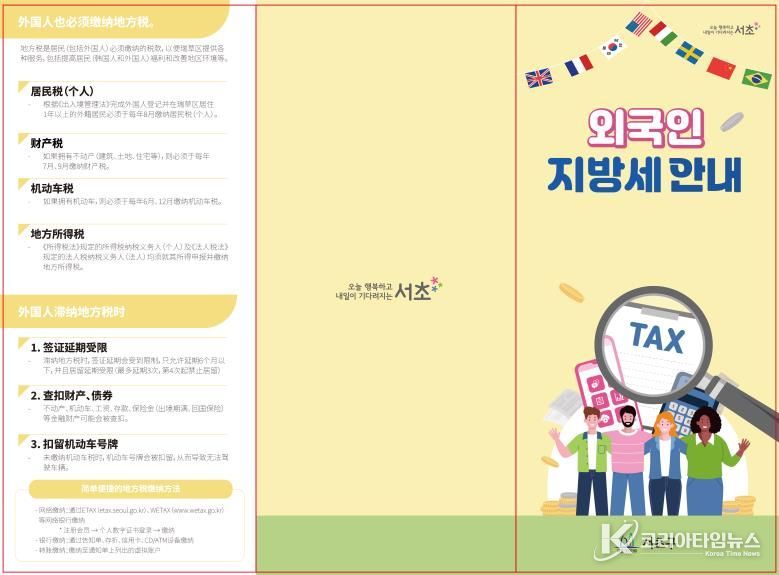 코리아타임뉴스 기동취재팀 | 서울 서초구는 지역 내 거주하는 외국인 주민들의 지방세 납부 편의를 위해 총 4개 언어로 제작한 ‘외국인 지방세 안내’ 리플렛을 제작해 배부에 나선다고 밝혔다.