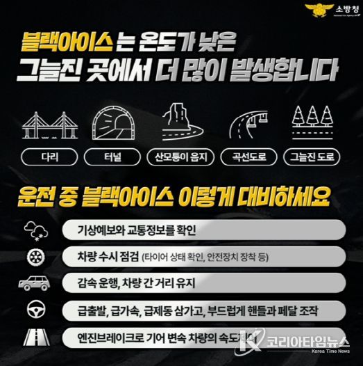 코리아타임뉴스 김태훈 기자 | 홍성소방서(서장 강기원)는 겨울철 기온 급강하로 인해 도로 위 블랙아이스 발생이 잦아짐에 따라 교통사고 및 보행자 안전사고에 각별한 주의를 당부했다. 블랙아이스는 도로 표면에 얇고 투명하게 얼어붙은 얼음층으로, 눈이나 얼음이 육안으로 잘 보이지 않아 운전자와 보행자가 인지하기 어려운 것이 특징이다. 특히 새벽과 야간 시간대, 터널 출입구, 교량 위, 그늘진 도로 구간에서는 갑작스러운 차량 미끄러짐 사고가 발생할 가능성이 높다.