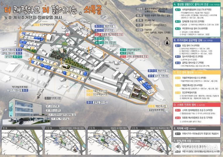 이번 사업은 우천면 우항리 일원 약 97,845㎡ 부지를 대상으로, 오는 2030년까지 총사업비 180여억 원을 투입해 노후 주택 주거단지 정비모델의 선구지역을 목적으로 한다.