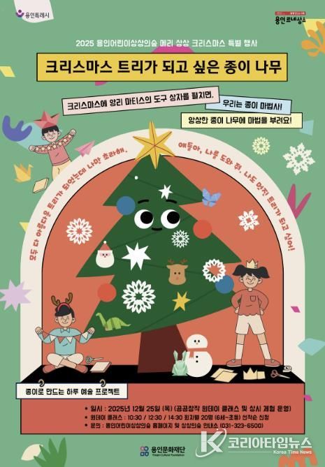 코리아타임뉴스 이아름 기자 | 용인문화재단은 오는 12월 25일에 크리스마스를 맞아 용인어린이상상의숲과 용인문화도시플랫폼 공생광장 일원에서 다양한 문화예술 프로그램을 즐길 수 있는 크리스마스 특별행사를 개최한다.