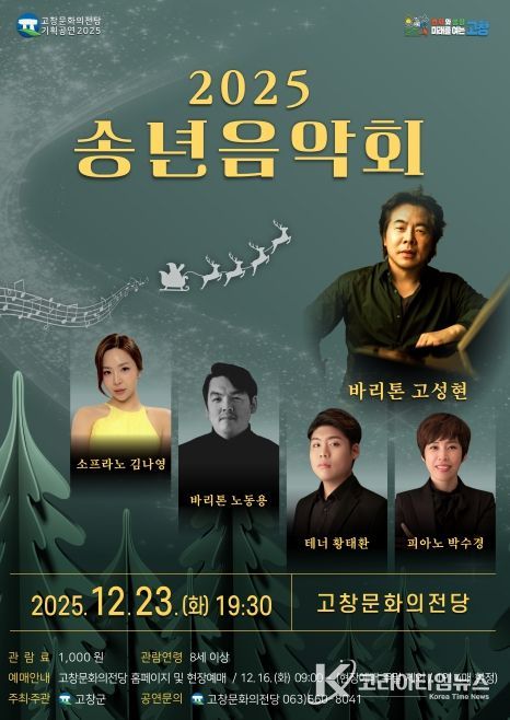 코리아타임뉴스 전북취재본부 | 고창군이 오는 23일 저녁 7시30분 고창문화의전당에서 ‘2025년 송년음악회’를 연다.