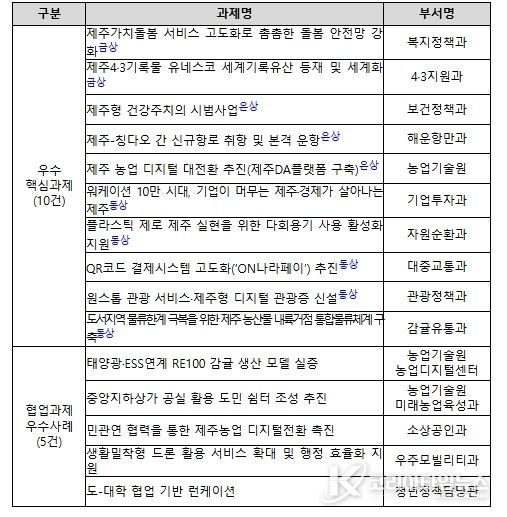이 가운데 상위 5개 과제가 이날 발표 심사를 거쳐 최종 순위를 가렸으며, ‘제주4·3기록물 유네스코 세계기록유산 등재 및 세계화’와 ‘제주가치돌봄 서비스 고도화로 촘촘한 돌봄 안전망 강화’ 과제가 금상을 차지했다.